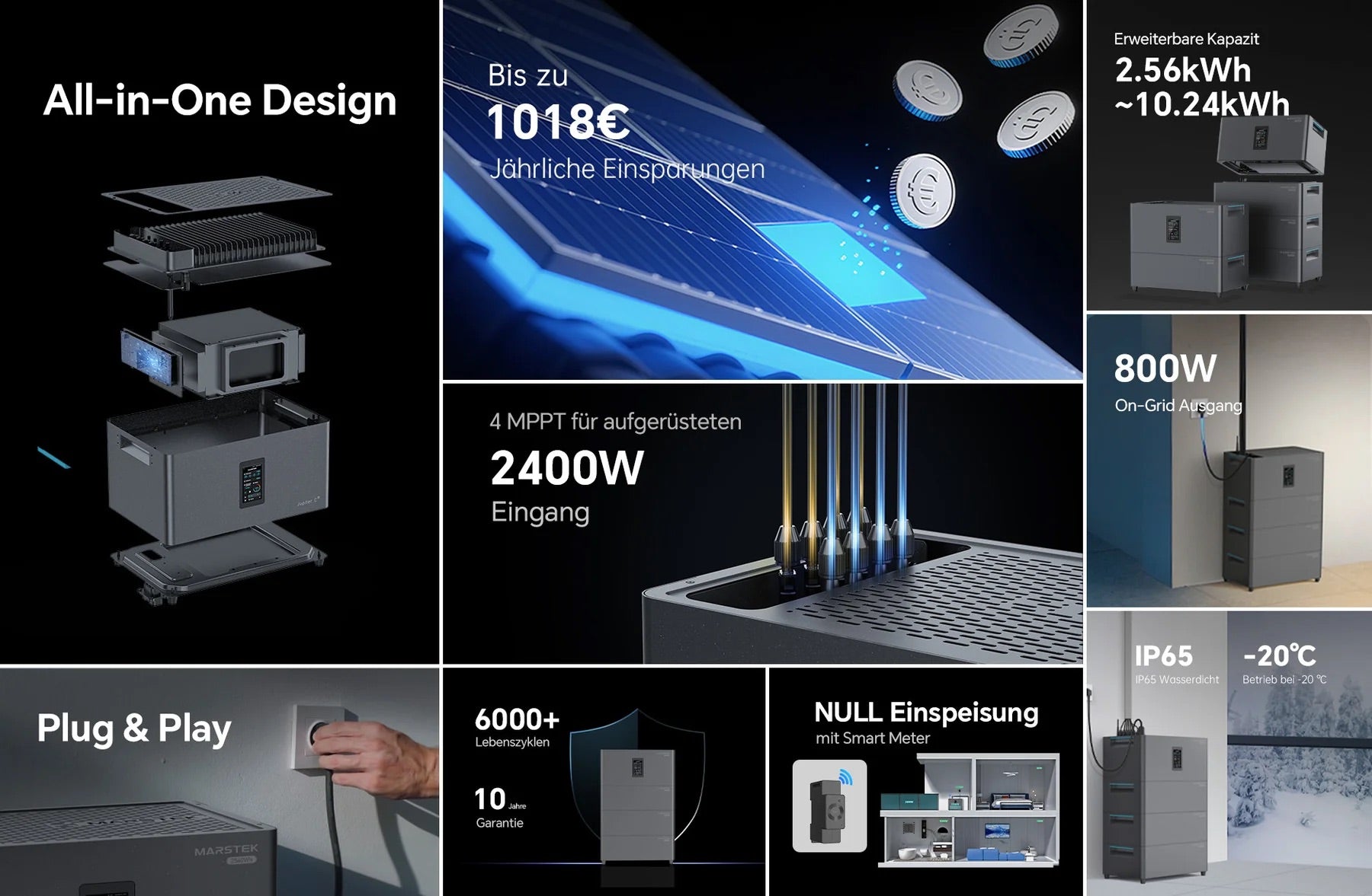 Mit 800 W Ausgangsleistung, integrierter 2,56 kWh LiFePO₄-Batterie, vier MPPT-Trackern und intelligenter Steuerung ermöglicht das System maximalen Eigenverbrauch und mehr Unabhängigkeit vom Stromnetz.